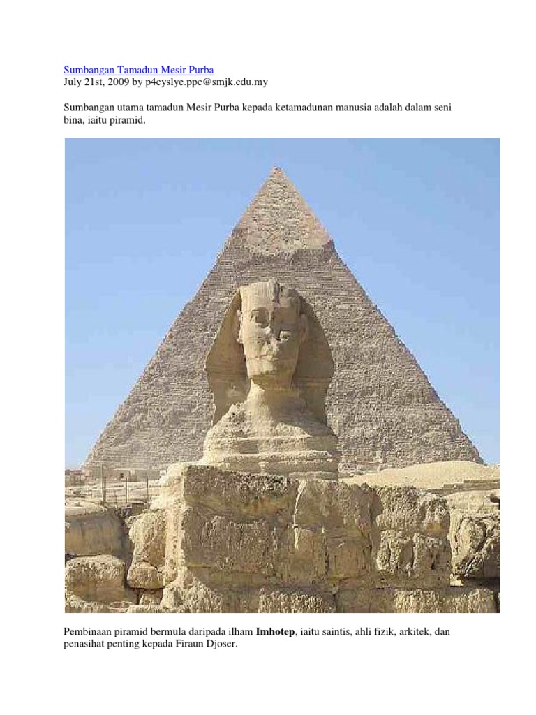 Marilah kami belajar sejarah tamadun mesir purba! Pembinaan piramid bermula daripada ilham imhotep. Pembinaan piramid bermula daripada ilharn imhotep, iaitu saintis, ahli fizik, arkitek, dan penasihat penting kepada firaun djoser (3150 s.m.). Beliau merupakan seorang ahli saintis,ahli fizik, arkitek dan penasihat penting kepada firaun djoser, iaitu firaun kedua pada dinasti ketiga. Latar belakang tamadun mesir dan tamadun awal india.